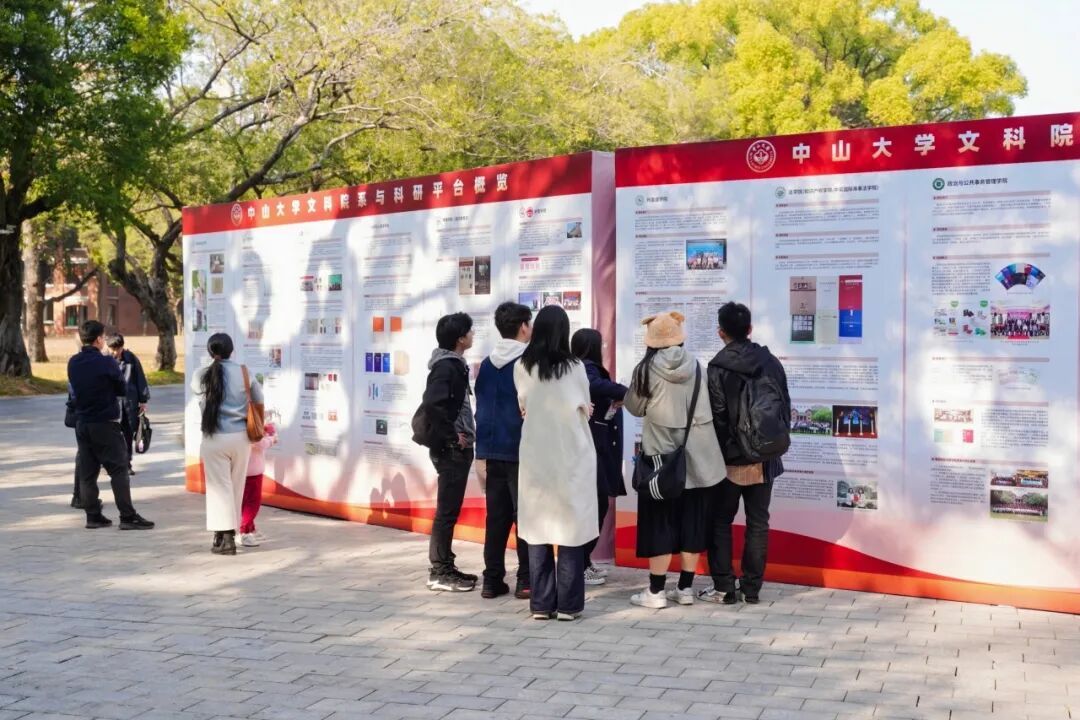 师生驻足观看怀士堂前文科院系与科研平台介绍展板