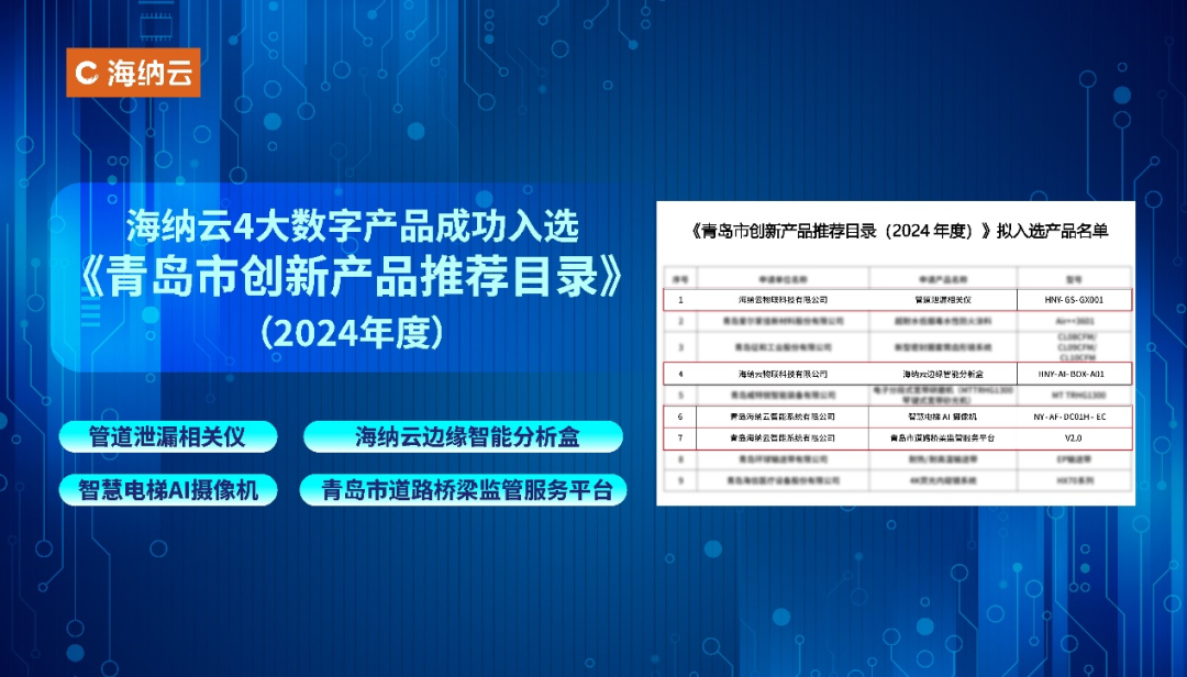 12月27日,青岛市工业和信息化局公布了《青岛市创新产品推荐目录(2024年度)》,海纳云申报的“管道泄漏相关仪”等4项数字产品成功入选。目前,海纳云获政府认定的创新产品达到15项,创新实力不断跃升。