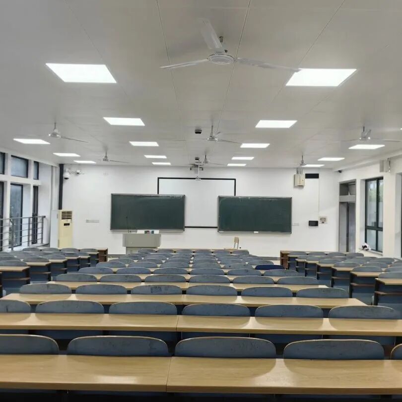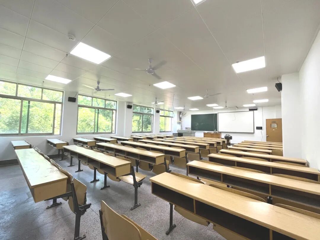 瞧,我们都穿上了“静音新衣”——吸音吊顶,从此告别嘈杂,让知识的声音更加清晰悦耳!电气线路也焕然一新,安全又高效!多媒体设备全面迭代,高清大屏加上智能操作,学习从此不再单调!