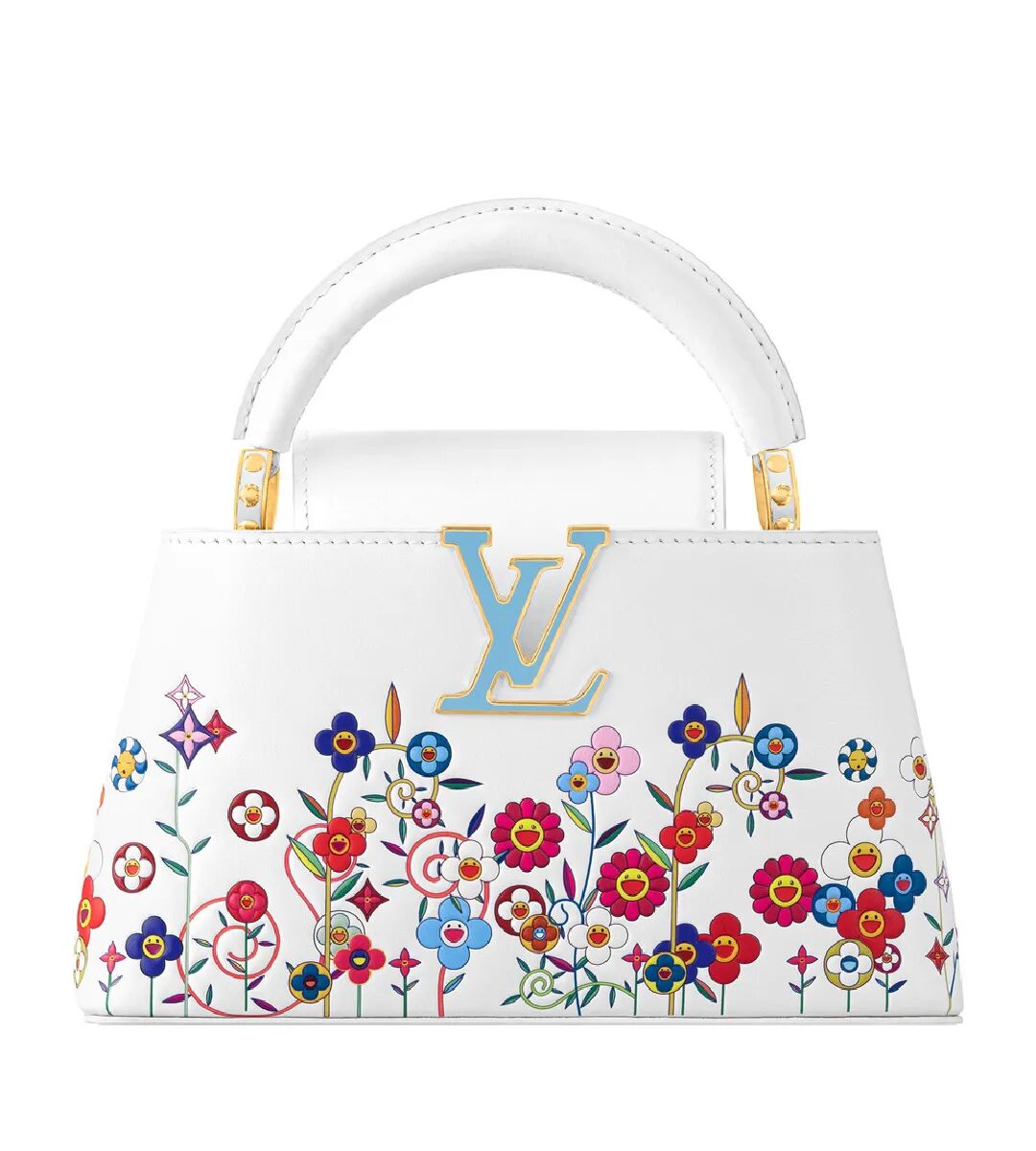 比过往创作更明亮的色彩:手袋被显眼的单一色调铺满,Monogram图案和Flower Parent and Child笑脸密不透风地拥抱在一起。