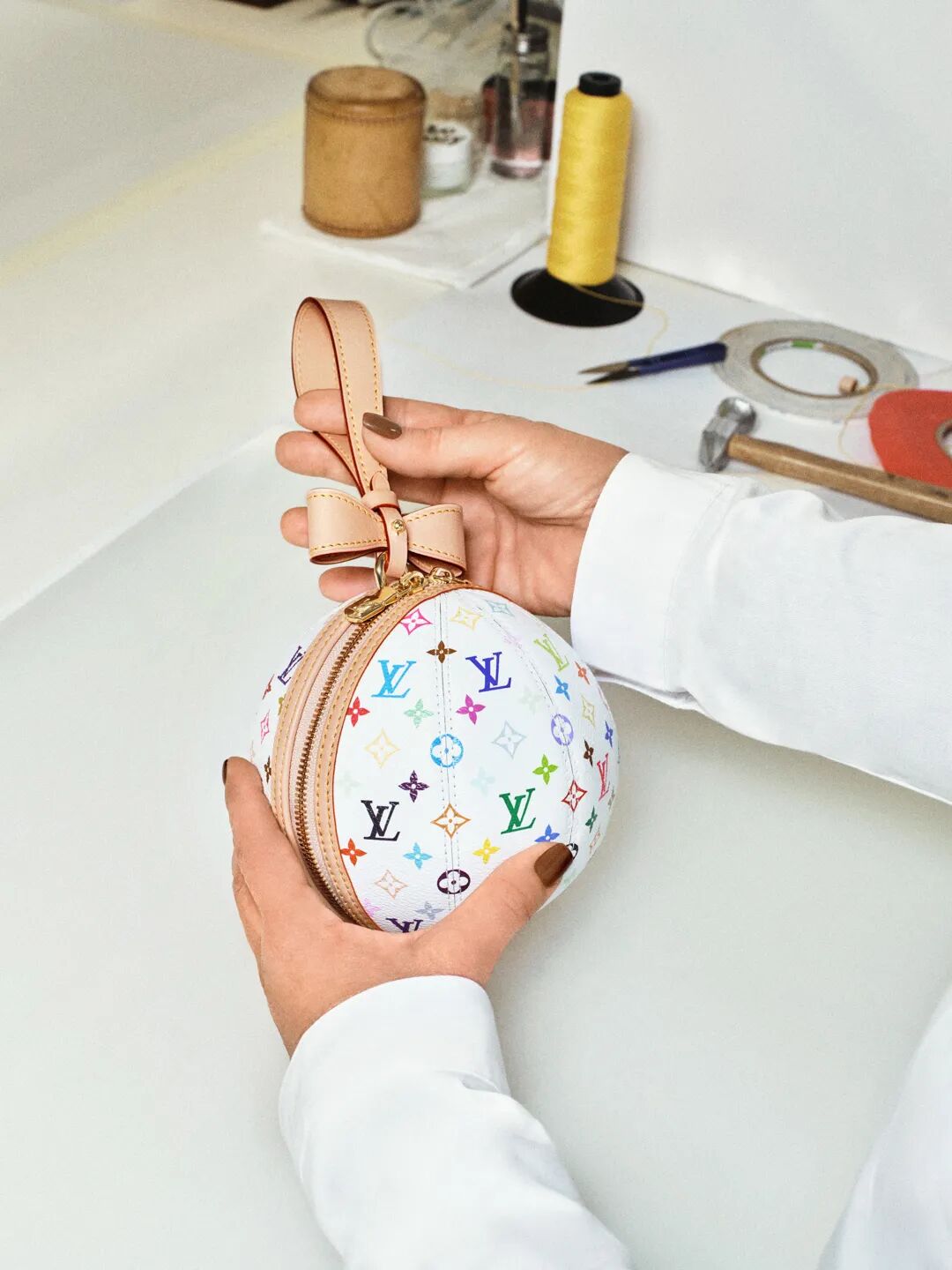 村上隆在洛杉矶、纽约长岛等多个城市设有工作室,但合作系列的设计却是在位于东京郊外的工作室内完成。这是一处东西文化交融的天地,村上隆曾在这里与Billie Eilish和Pharrell Williams共同创作音乐录影带,而后者也正是目前路易威登的男装创意总监。IV. LV Hands