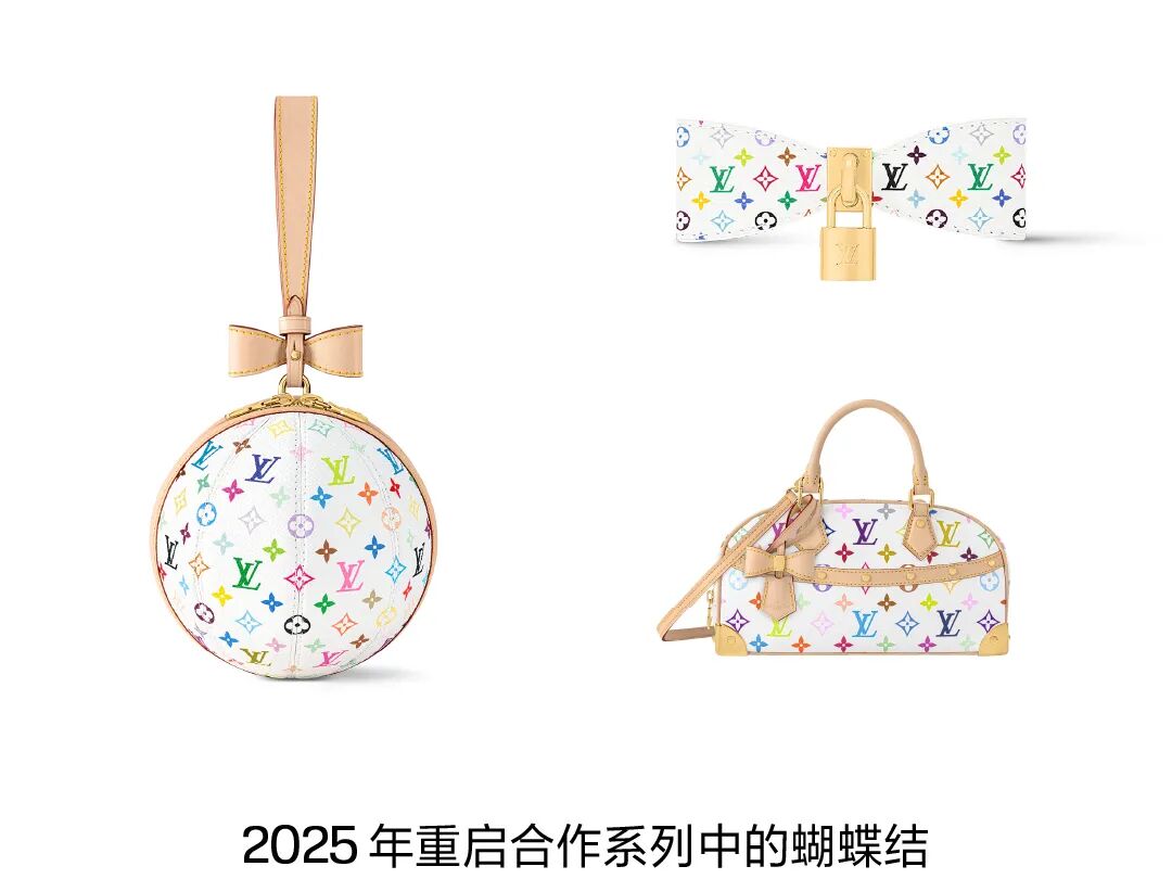 蝴蝶结贯穿多件作品,这既是日式漫画中常见的标记,也是村上隆从卡哇伊文化中汲取灵感的体现。蝴蝶结元素将在新系列中作为经典符号回归,在手袋上表现为蝴蝶结造型的皮革系带和拉链。