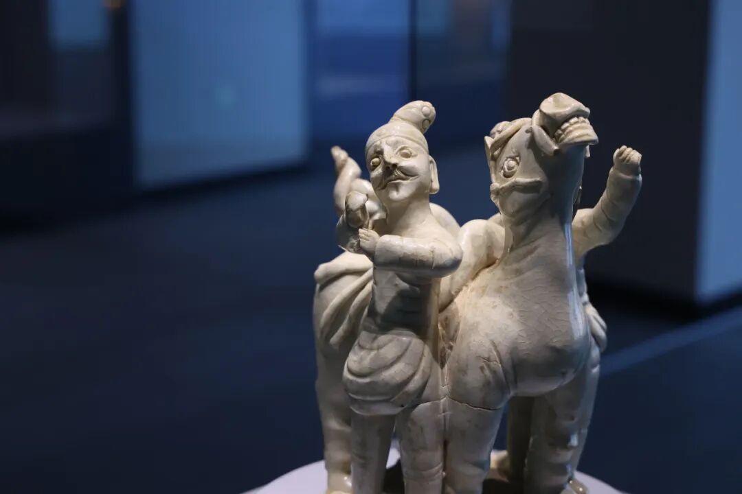 长方板形底座之上有骏马一匹,其两侧各立一位圆目高鼻、八字长胡、发髻高挽、脚蹬长靴、身着胡裙、头仰前视的胡人,其中一人手作牵引状。马上马鞍绳套齐全,骏马作嘶鸣长啸状,俨然整装待发。牵马俑胎质白细,底座之外满施青白釉,釉质莹润,光洁透亮,是青白瓷的绝好佳作,为景德镇湖田窑烧造。