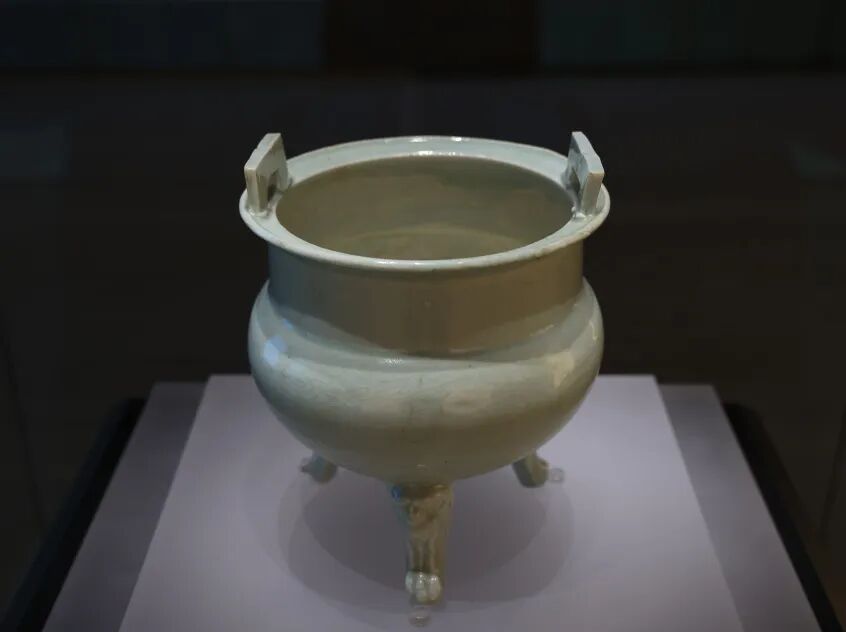 直口,圆唇,外折沿,口沿上两立耳,短直颈,圆腹,下腹内收成平底,三兽足,兽足上端刻划兽面,下端刻划爪趾。造型古朴。内外壁施以青白釉。此器是仿青铜器造型的瓷炉,制作精良,造型优美,十分珍贵。