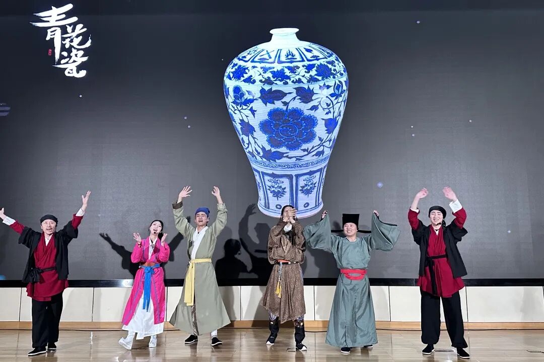 “青花瓷”沉浸式真人演出加开场次,吸引了众多观众。演员们采用小话剧的形式,深入挖掘文物背后的故事,并巧妙融入现代年轻人喜爱的网络热梗与幽默语言,使得文物背后的历史文化变得更加易于理解和亲近。幸运观众的抽奖活动,让现场气氛高潮迭起。