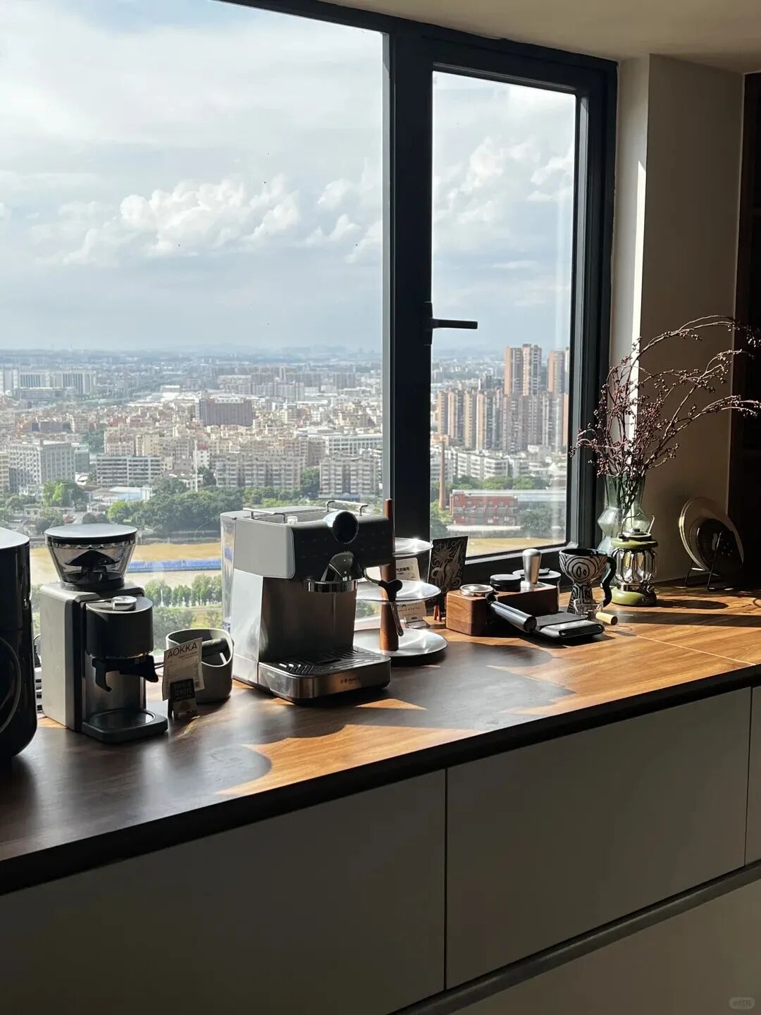 一定难以想象,将原本静谧的飘窗区域变为一个西厨吧台,会是什么样?定制的吧台桌紧贴飘窗边缘,延伸出的一排高脚凳,让家人在享受美食的同时,也能将窗外的美景尽收眼底。
