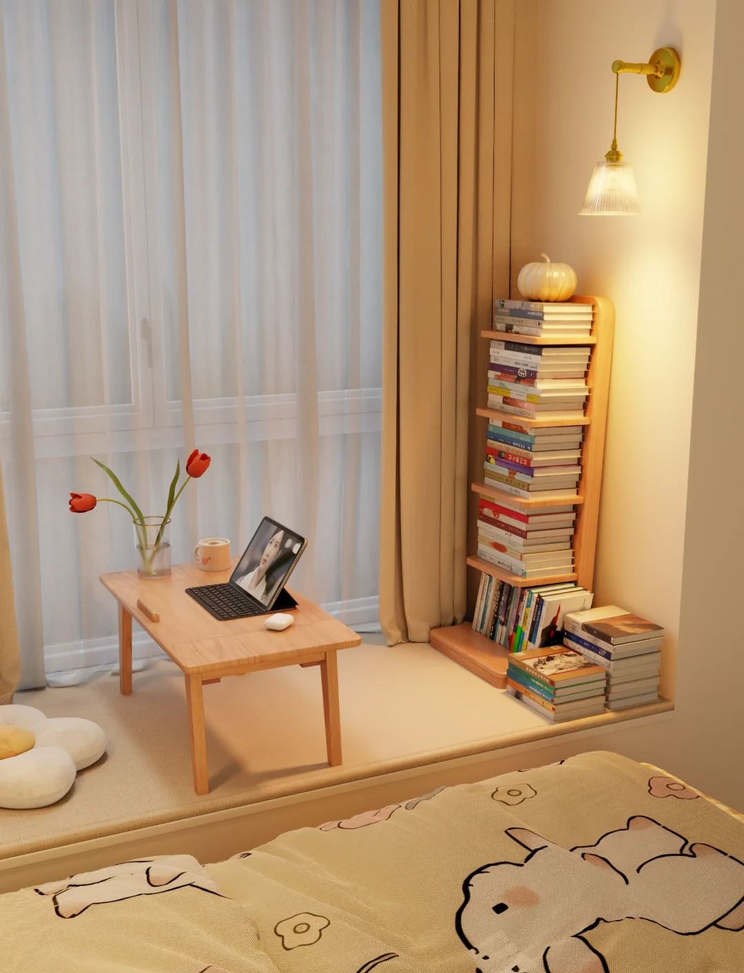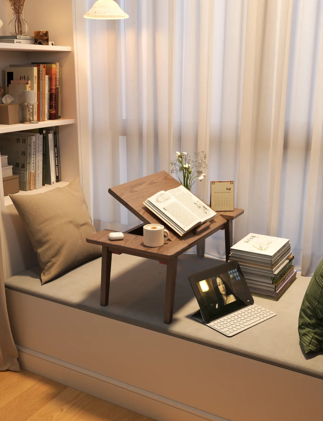 构筑飘窗读书角,喧嚣尘世中辟得一方静谧天地。放一柔软坐垫轻抚疲惫,白天趁着阳光,晚上一盏造型落地灯,为时光镀上一层金色的梦幻。窗外四季更迭,每天目光的跳跃,让人忘却时光,沉醉于日常印记。
