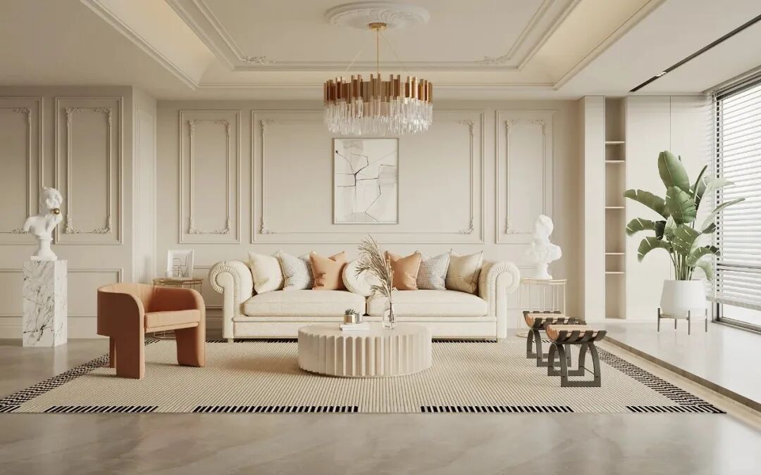 传统中古欧式注重精致装饰,家具、墙壁、地板常见雕花、线条和图案,如英式印花、法国拼花。罗马柱、腰线、拱形等元素,增添空间的豪华与优雅。家具上,倾向大尺寸和沉重感,水晶吊灯等华丽饰品,进一步提升空间的艺术气息。