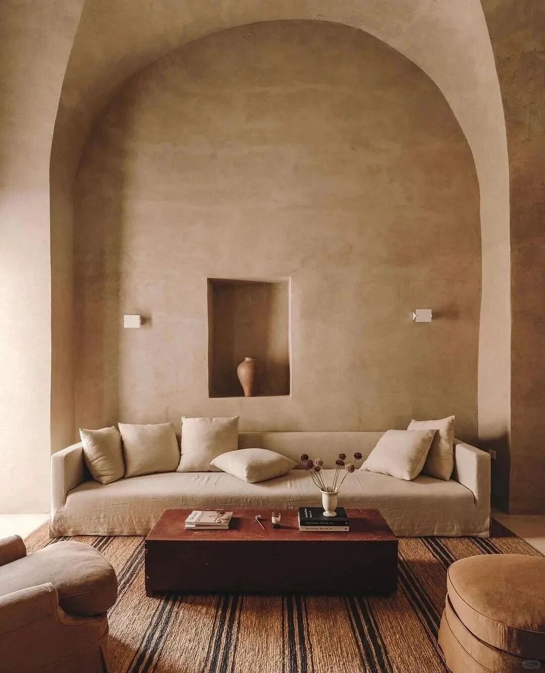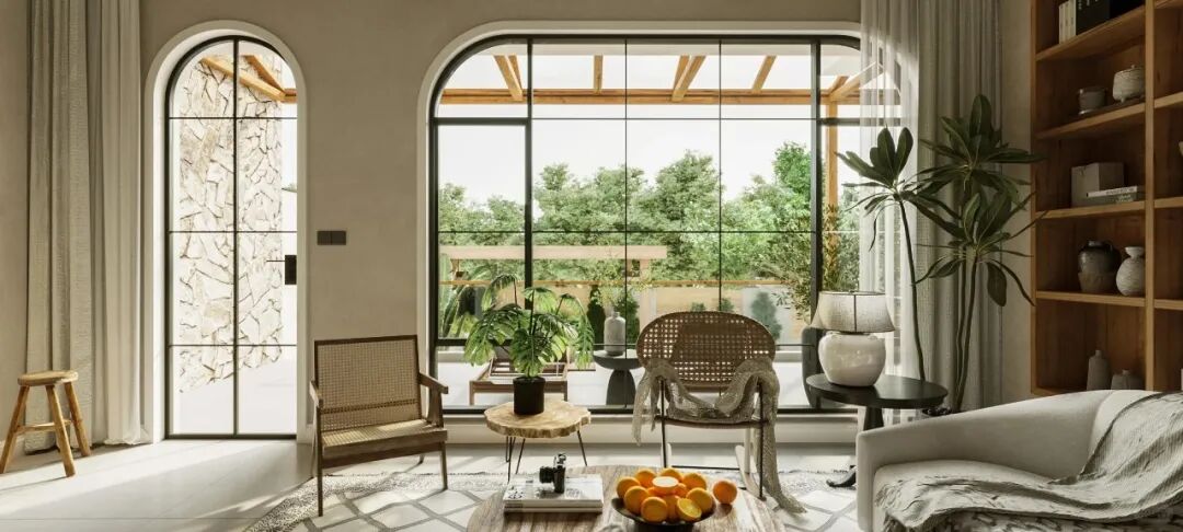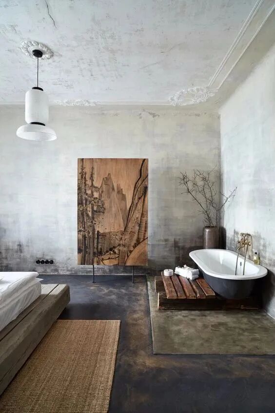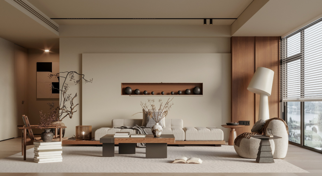 侘寂风常用灰白、原木、大地色为基础用色,呈现东方传统乡村的原始风情,带有一定的禅意。也会微水泥、复古感木质材料突出一种原生质感。常用陶罐藤垫、花艺绿植、风干木器等作为装饰。