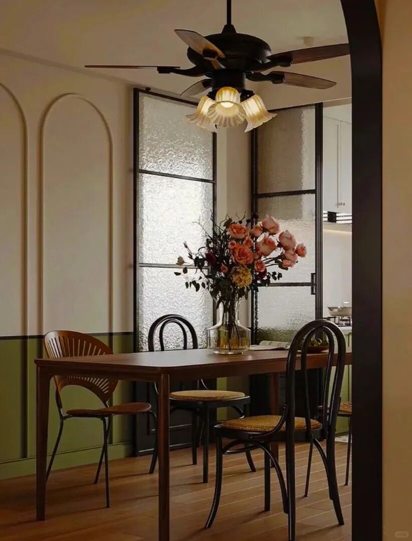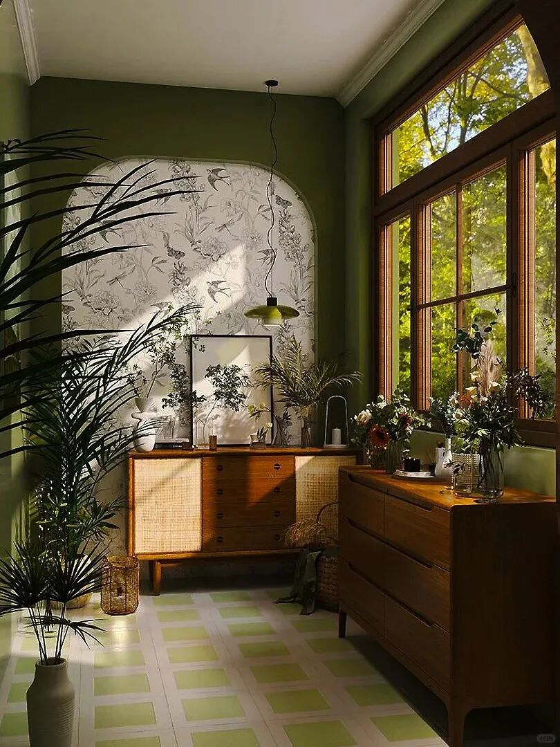 最浪漫的装修风格,深受部分女士的喜爱,装修配色大胆,比如复古绿、复古红,红棕色,黑白橘等,搭配精致复古的软装,和厚重和油亮质感的热带绿植,充满地域浪漫特色。