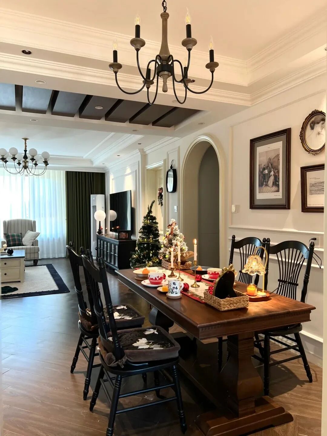 古典(复古)法式:强调轴线对称和宫廷元素,使用深色系地板和大胆的跳色搭配,有的喜欢大胆使用绿色,材质上多用木质、皮革和黄铜,搭配法式石膏线和雕花拱门,营造出浓烈的浪漫气息。