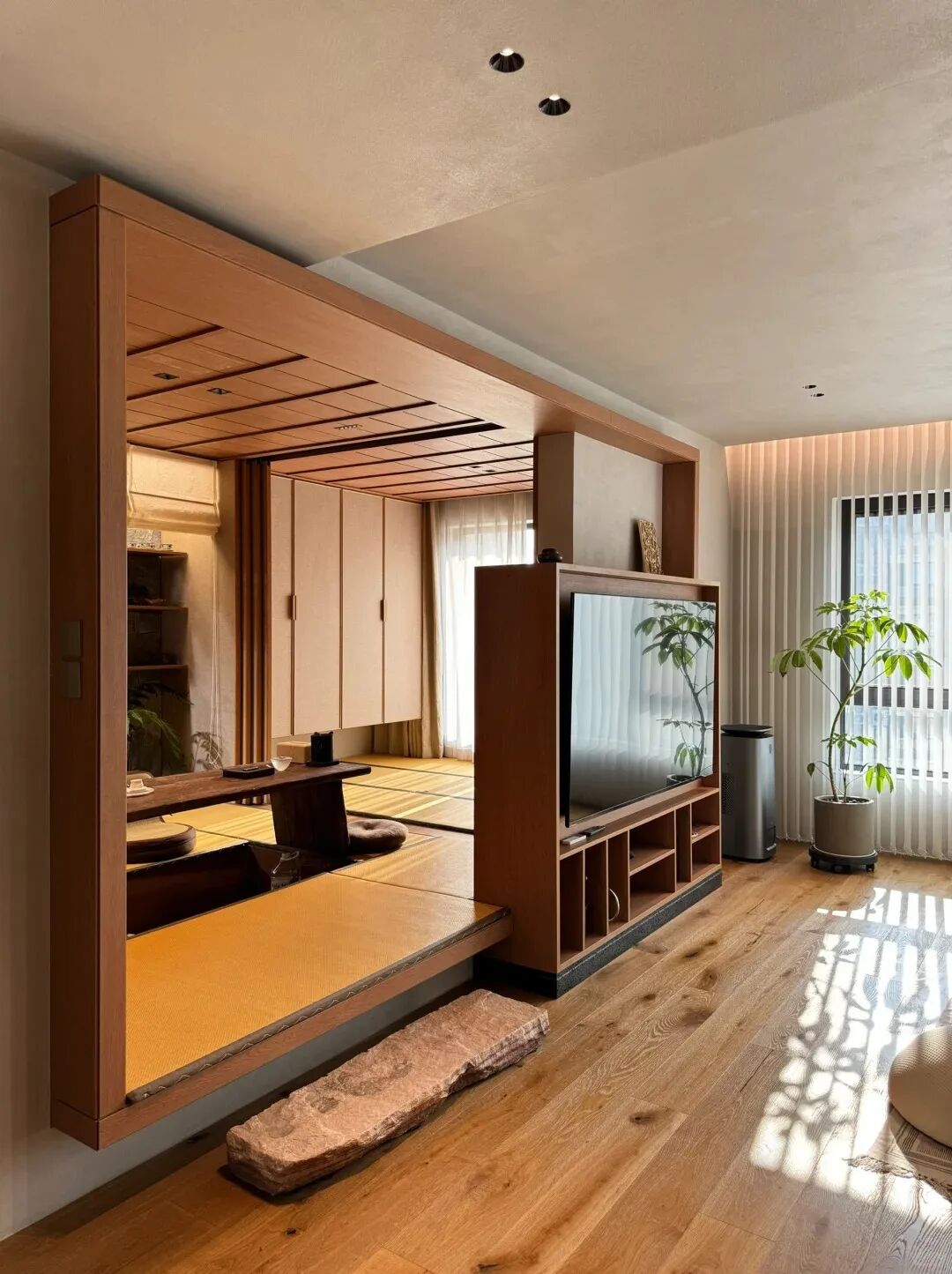 ①日式风的设计中大量采用木质材料,如木饰面板、栅格隔断。