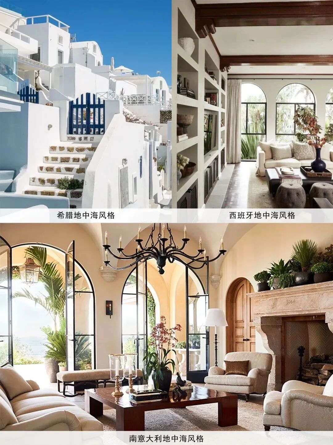 地中海风格以其明亮、清新和自然的特点受到喜爱,使用白色和蓝色为主色调,也有黄褐色风格,家具简单实用,装饰自然,常见拱形门窗和瓷砖装饰,营造出轻松、愉悦的居住环境。