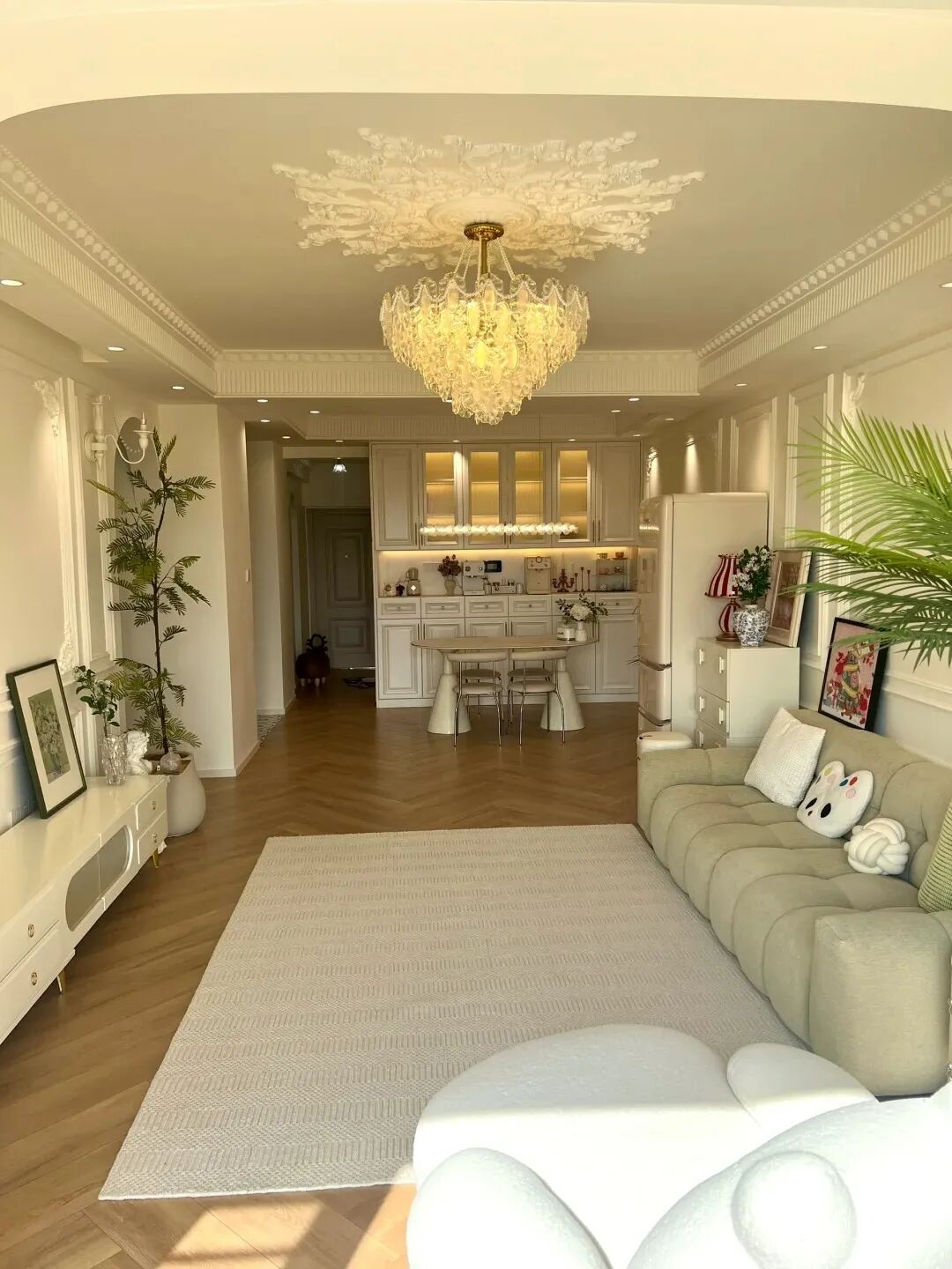 轻法式:结合现代简约与法式浪漫,摒弃繁复装饰,采用经典轴线和对称布局,以暖白、奶油色为主色调,打造出柔和、优雅的居住空间。