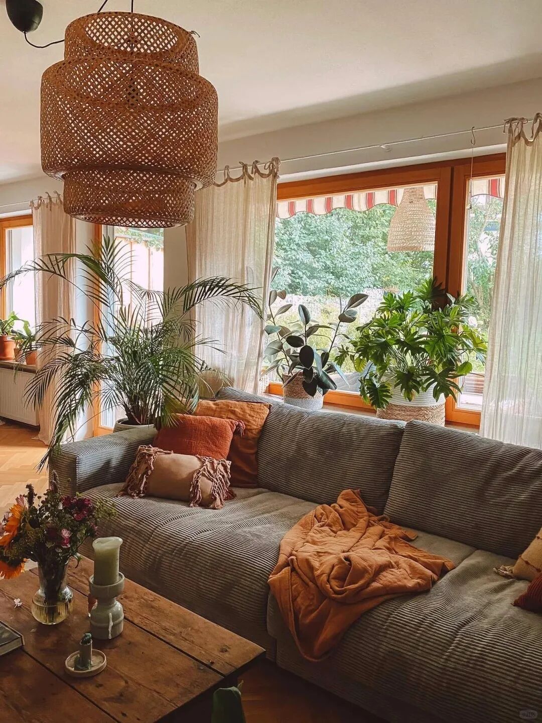 南洋风居住空间夹杂着春日静谧与热带雨林夏日热浪的丰沛感,喧哗到此处静止。最大的特点是草木绿和藤编家居的完美组合,还有自然生长木纹以线条感存在。