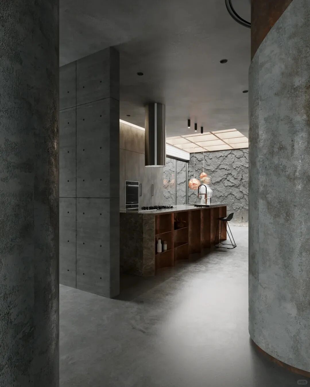 工业与原木相反,以黑棕色为主色调,搭配人工金属质感的元素,打造出独特的工业风情。包括钢管、石皮、红砖等材质,甚至可以不吊顶,裸露管线,毛胚房简单装饰,表达水泥砖墙粗犷之美,也有进阶科技风的。