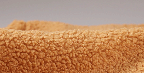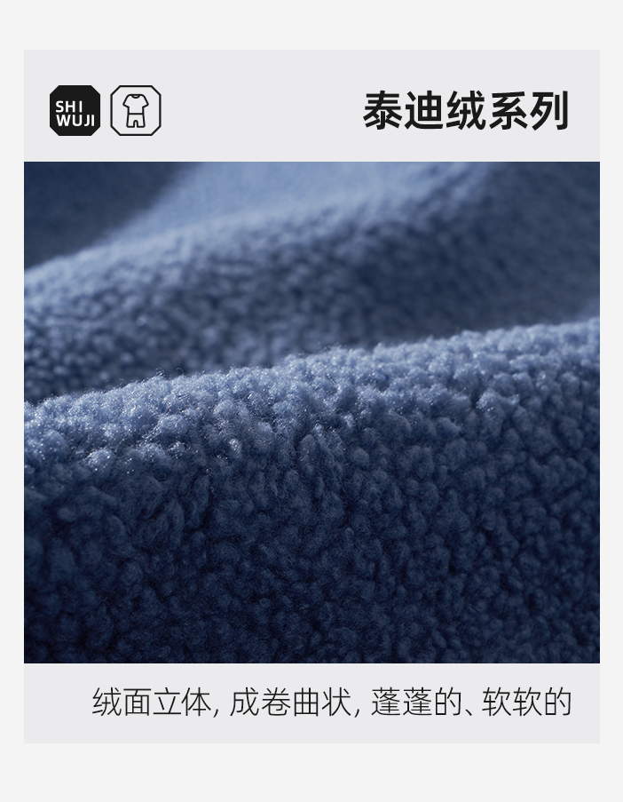 泰迪绒,顾名思义就是外观酷似泰迪犬毛的面料,毛茸茸的,摸起来很舒服。泰迪绒的绒面更为立体,成卷曲状,蓬蓬的、软软的,看着就很暖乎乎的,厚实却不会厚重压身,穿上身满满的都是安全感。