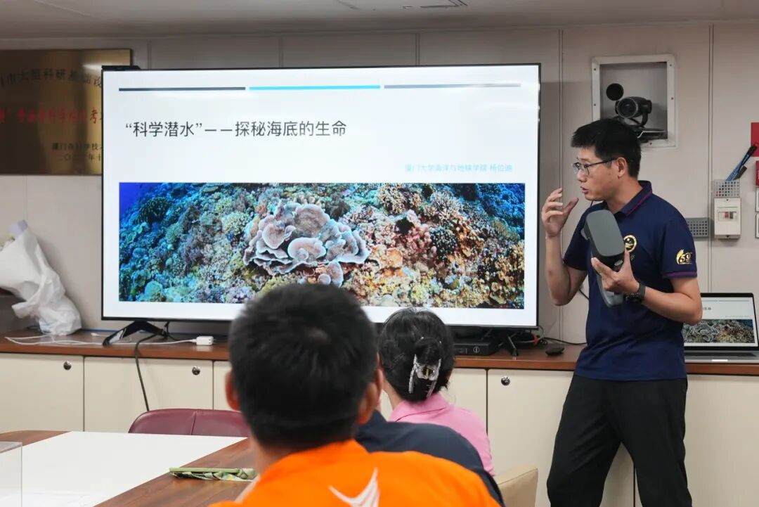 作业之余,导师组在每日例会上分享各自的首席经验,强调作为航次首席需要的责任感和决断力。参航人员也互相分享了各自的科考经验,此外厦门大学科考船运行管理中心王海黎主任进行海上科考外交申报经验分享,王丽芳工程师和杨位迪高级工程师也分别进行营养盐国际比对实验和水下摄影的经验分享。