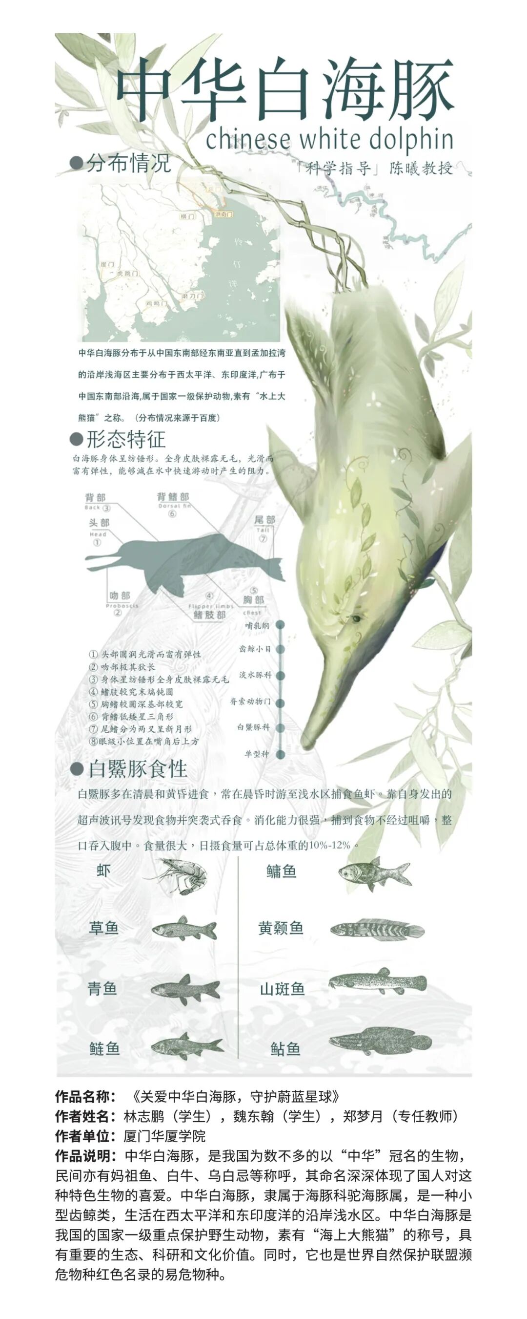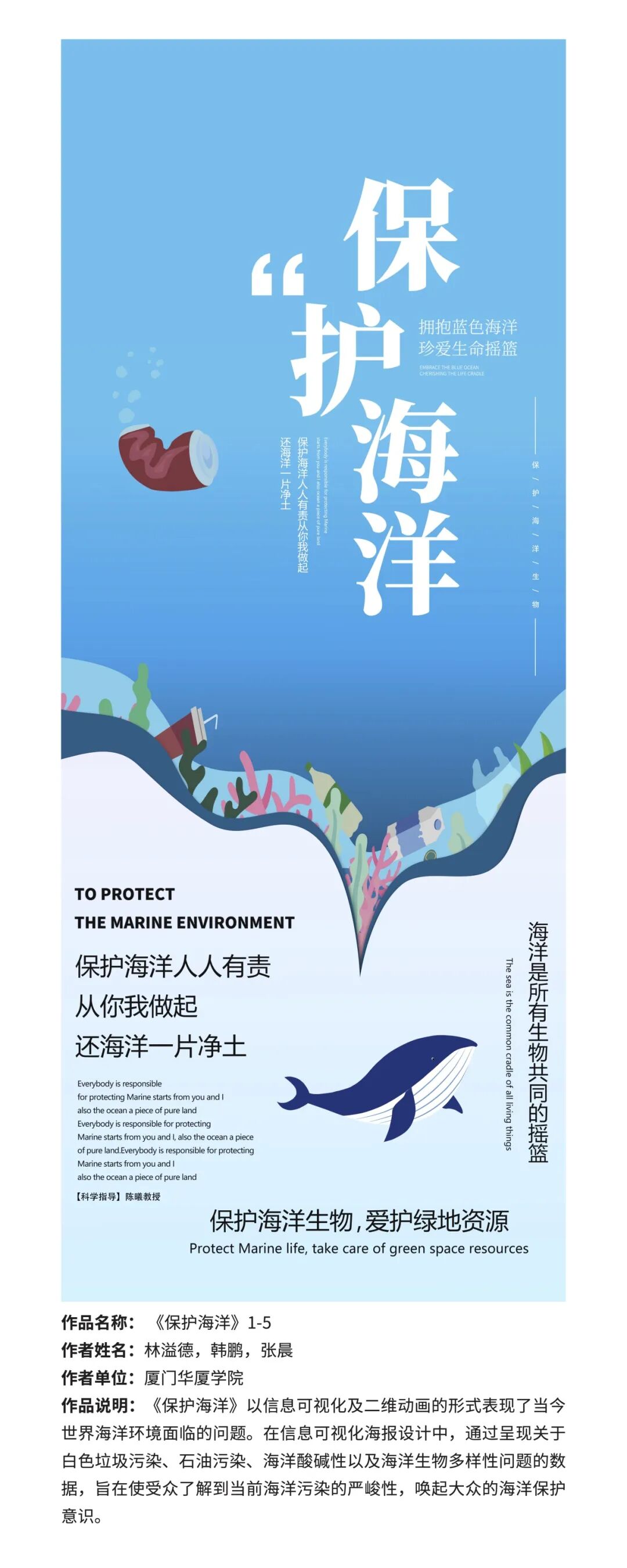 作品极富创造力地融合了”地球“、”海洋“、”动物“等元素,带我们走进奇妙的幻想世界,可爱的白鲸和水母仿佛在和我们一起玩耍......通过这些作品,能够感受到同学们的创意和热情,感受到他们对地球环境保护的认识和思考。