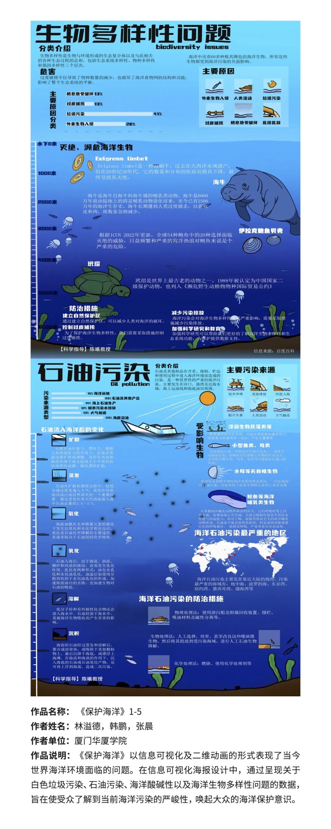 “蓝天碧海护卫队”针对厦门市出行高峰期交通拥堵、城市噪声污染严重等现象,提出滨海城市生态改造计划,提倡垃圾分类,变废为宝;增加绿植,削弱噪声、吸收尾气等,让环保意识与人文意识共存。
