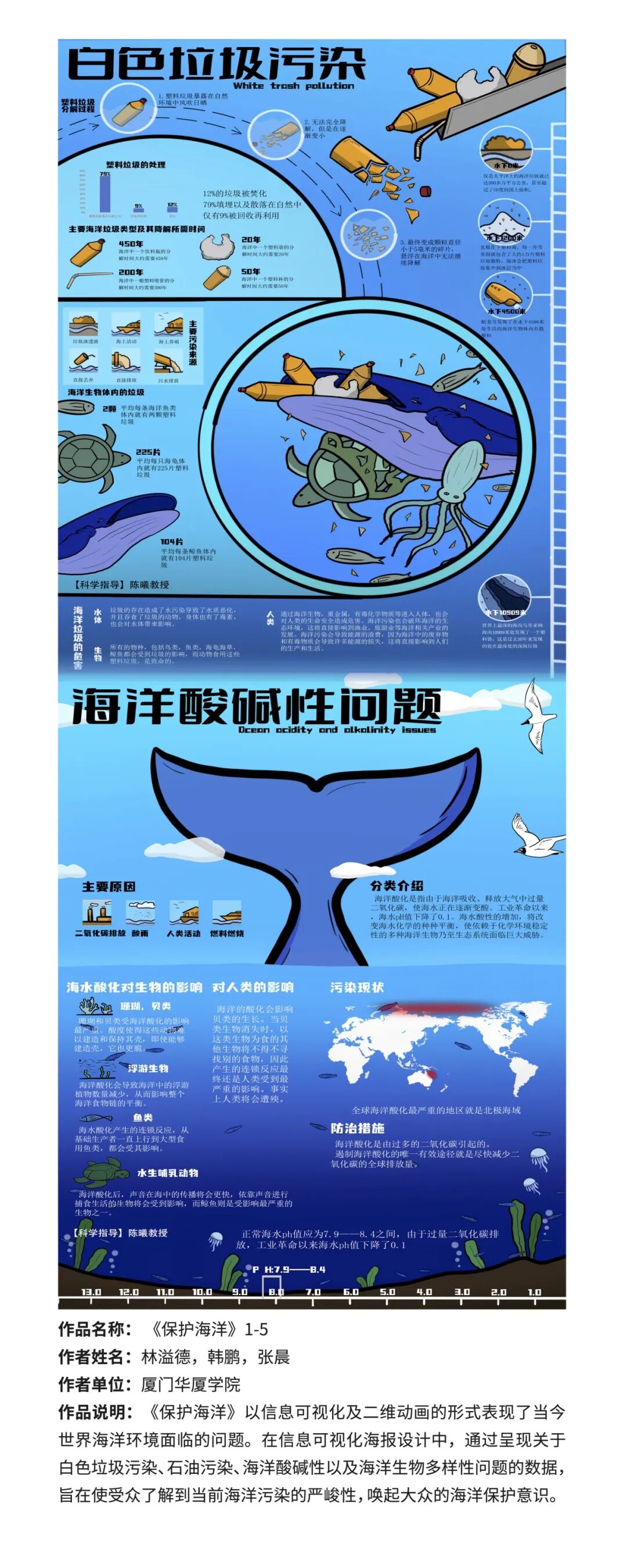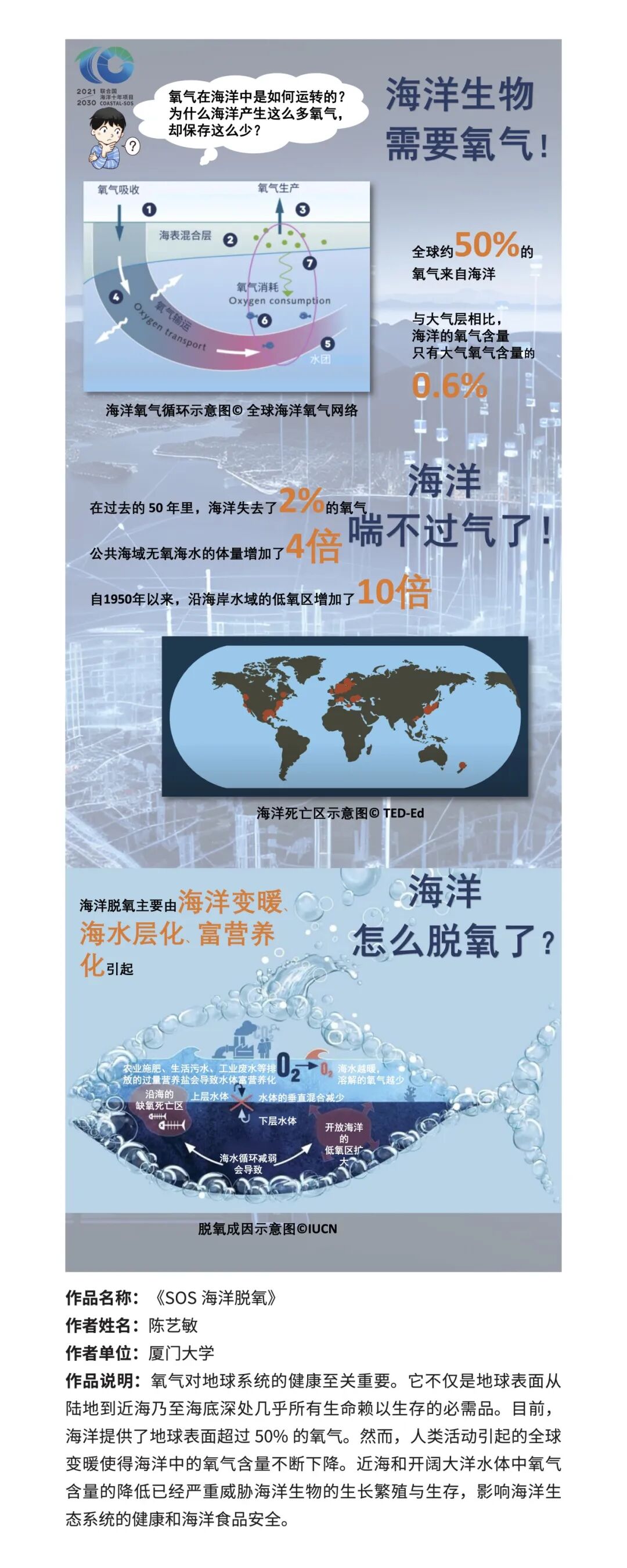 “狂拽酷炫破风浪队”认为,由温室效应加剧所导致的全球变暖和海洋酸化将使得某些浮游植物的生存受到威胁,浮游植物的多样性、生物量、初级生产力以及物种组成等会遭到不同程度的影响,从而导致其碳固定的减弱,进而加剧海水脱氧,并针对如何改善这些连锁反应所带来的问题提出了可持续发展措施的建议。