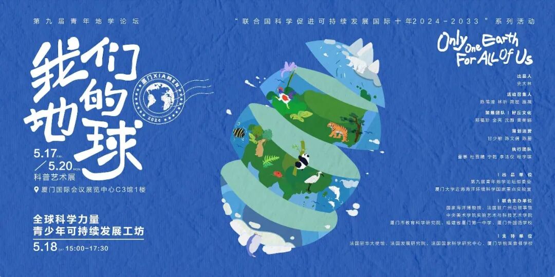 由第九届青年地学论坛组委会、厦门大学近海海洋环境科学国家重点实验室发起,联合国家海洋博物馆、法国驻广州总领事馆、中央美术学院实验艺术与科技艺术学院、厦门市教育科学研究院、福建省厦门第一中学、厦门外国语学校、好丘文化、厦门华锐莱普顿学校等共同开展: