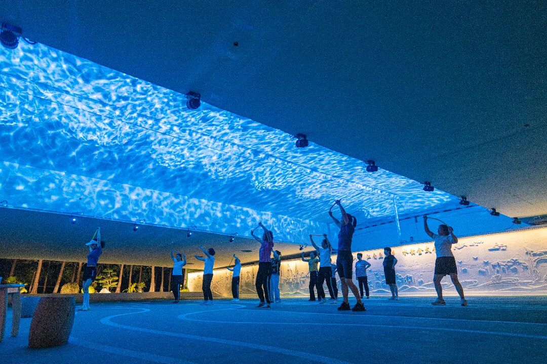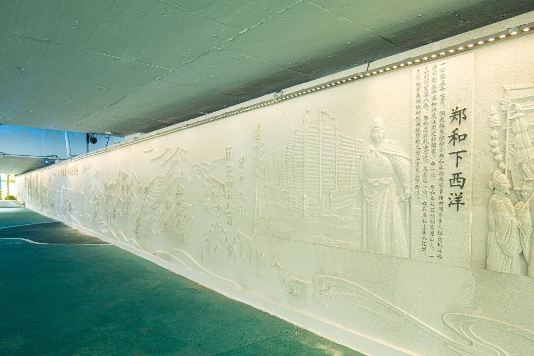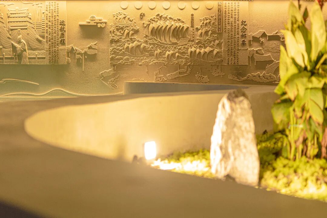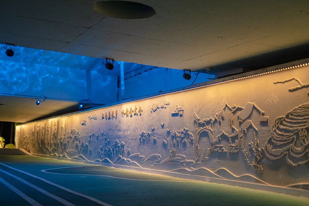 空间三是休闲活动空间,一整面浮雕墙展现了昆曲艺术与人文景观,融入水文化符号的大片铺装无疑是很好的交流平台,让你在欣赏文化的同时,也能与志同道合的朋友一起互动活动。