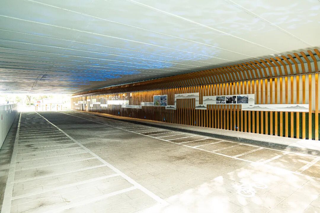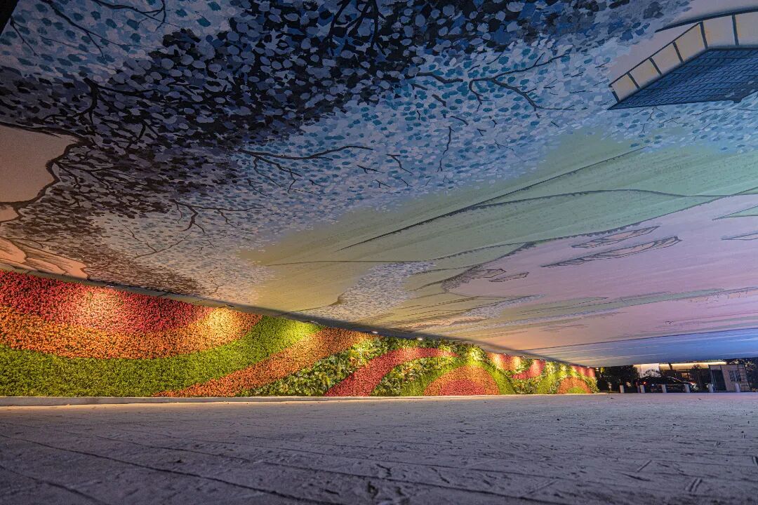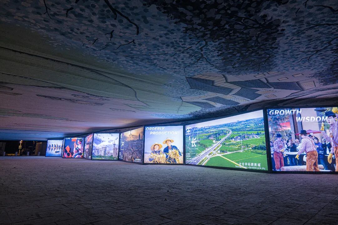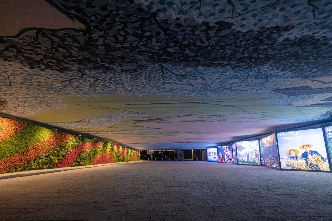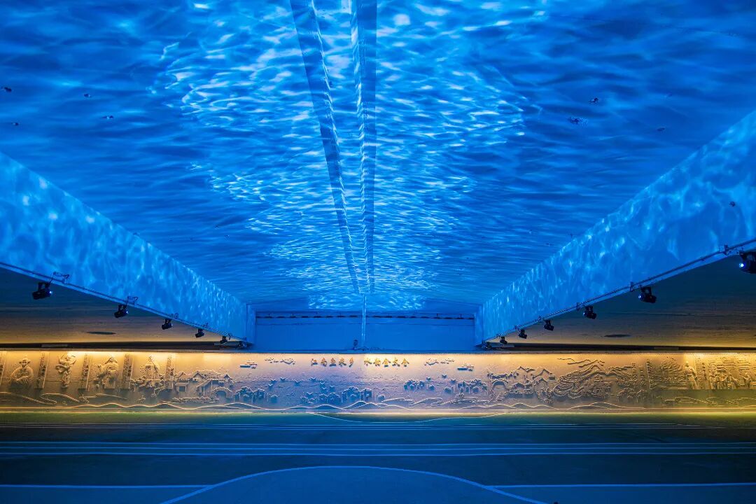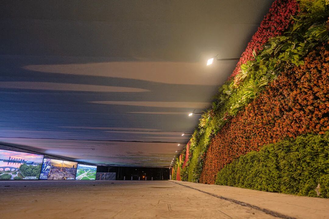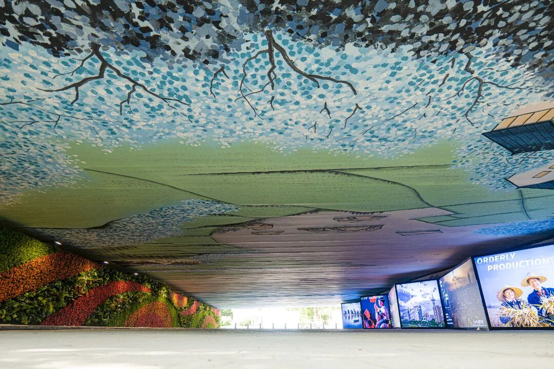 空间一是通过性与公共文化展示空间。这里的顶板彩绘水道纵横交织,湖塘星罗棋布,农田、房屋、水系、船帆错落交织,一片祥和,和大片绿植墙相互辉映,让人沉醉不知归路。立面的灯箱仿佛是一座时光的宝库,展示着宜居新城的美好影像。