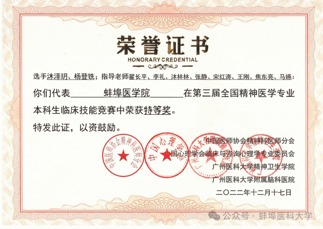 第三届全国精神医学专业本科生临床技能竞赛特等奖