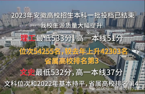录取生源分数和排名明显提升。2023年安徽省第一批次录取理工类省属高校排名第三、文史类排名第四。近年来,学校985、211、双一流等优质高校推免录取率达74%以上。近三年,毕业生就业率保持在91%以上。