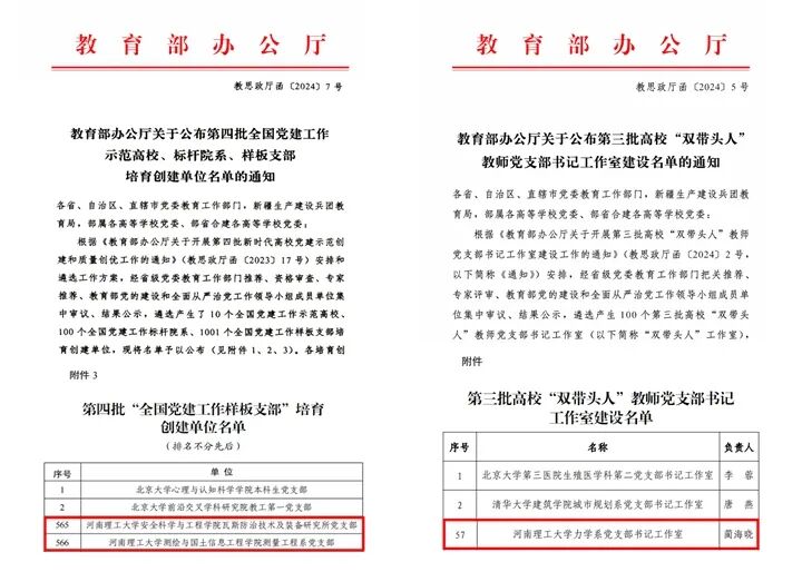 学校进一步夯实基层党组织建设,各项工作取得新成效。教育部办公厅下发文件,学校安全学院瓦斯防治技术及装备研究所党支部、测绘学院测量工程系党支部等2个党支部入选第四批“全国党建工作样板支部”培育创建单位;土木学院力学系党支部、资环学院地球信息科学与技术系党支部、能源学院新能源科学与工程系党支部等3个党支部入选全国高校“双带头人”教师党支部书记“强国行”专项行动团队;土木学院力学系党支部作为河南省高校唯一基层党组织入选第三批全国高校“双带头人”教师党支部书记工作室,取得学校在该项荣誉的首次突破。