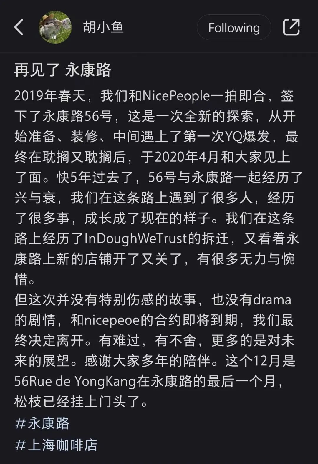 老板娘胡小鱼在个人平台上表示,这次关店的原因与拆迁无关,主要是因为和NicePeople的合约到期,最终她们决定离开。但值得期待的是,原来在街角因拆迁关闭的In Dough We Trust会在明年春暖花开时,和大家再见面,一起创造新的回忆吧~