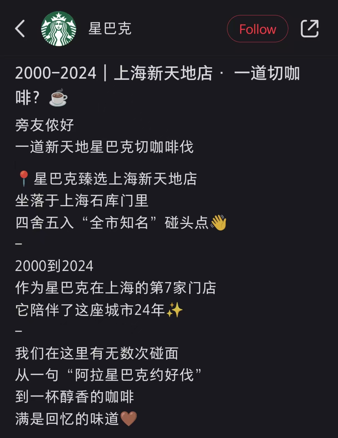 星巴克在上海的第7家门店,在新天地开了24年的星巴克,于2024年12月16日正式闭店。