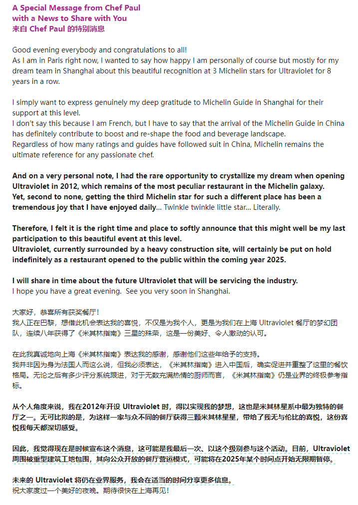 连续8年蝉联米其林三星的魔都传奇餐厅Ultraviolet,在2025上海米其林榜单发布的第二天,宣布可能将在2025年某个时间点开始无限期暂停营业。
