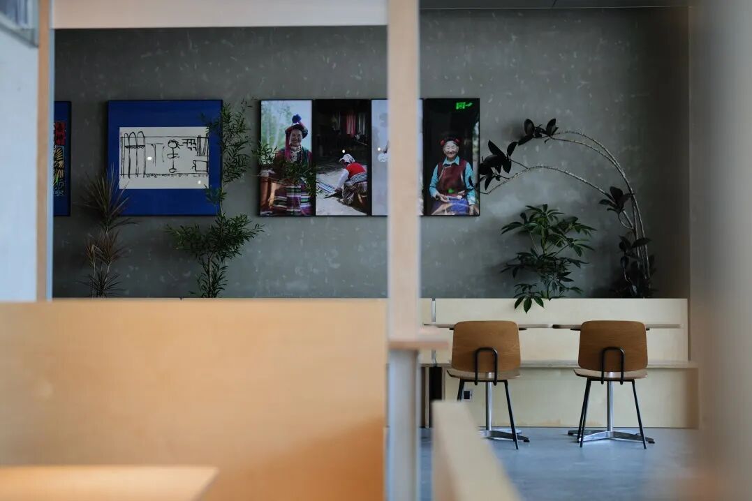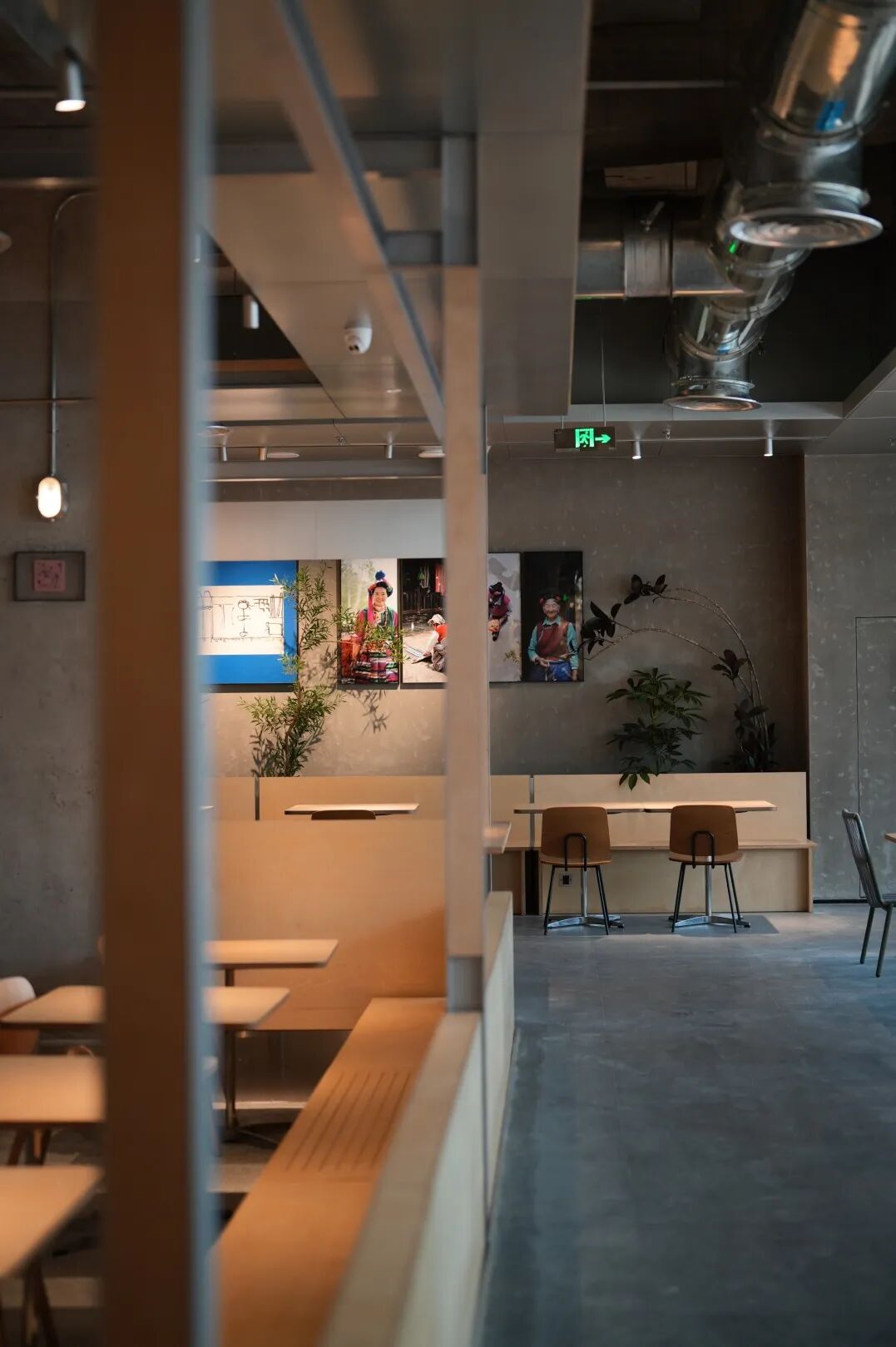 诗与远方留心落到了新空间的每个角落,云南抚仙湖的捕鱼、香格里拉织彩虹的人、腾冲在地纹样的艺术表达、大理非遗甲马、李哥的东巴文,样样都充满了云南的气息与人文的关怀......原有的清水混凝土结构被精心的保留并裸露出来,可以感受到建筑的力量感,都市审美与山野之趣的共存。