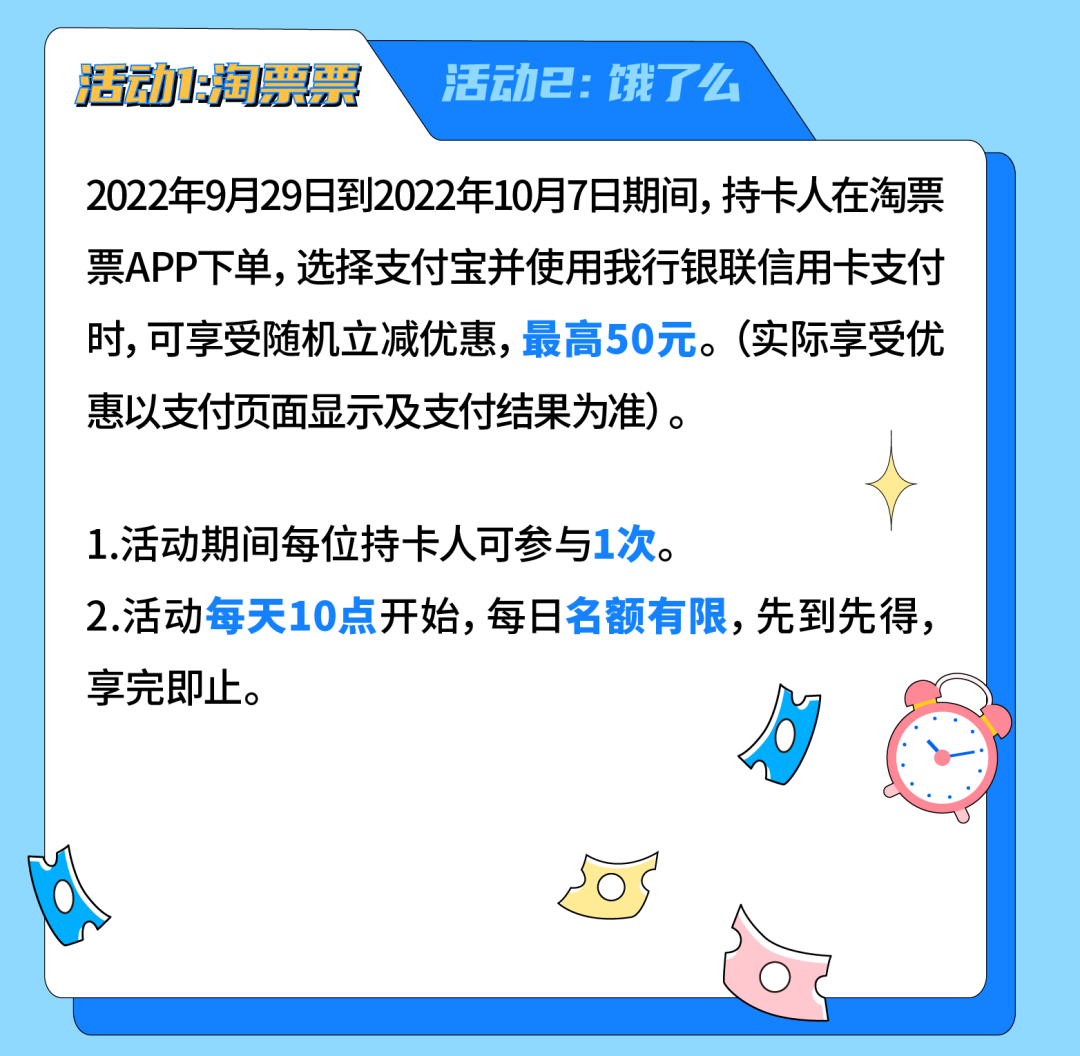 1)淘票票:客户在淘票票APP下单,选择支付宝并使用我行银联信用卡支付时,可享受随机立减优惠。
