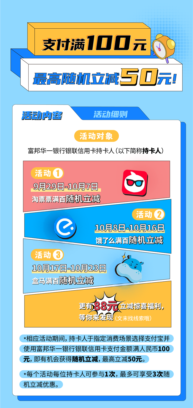 3)盒马:客户在盒马APP、支付宝端内盒马小程序、手淘端内盒马小程序、盒马线下门店通过支付宝结算时使用我行银联信用卡可享随机立减。