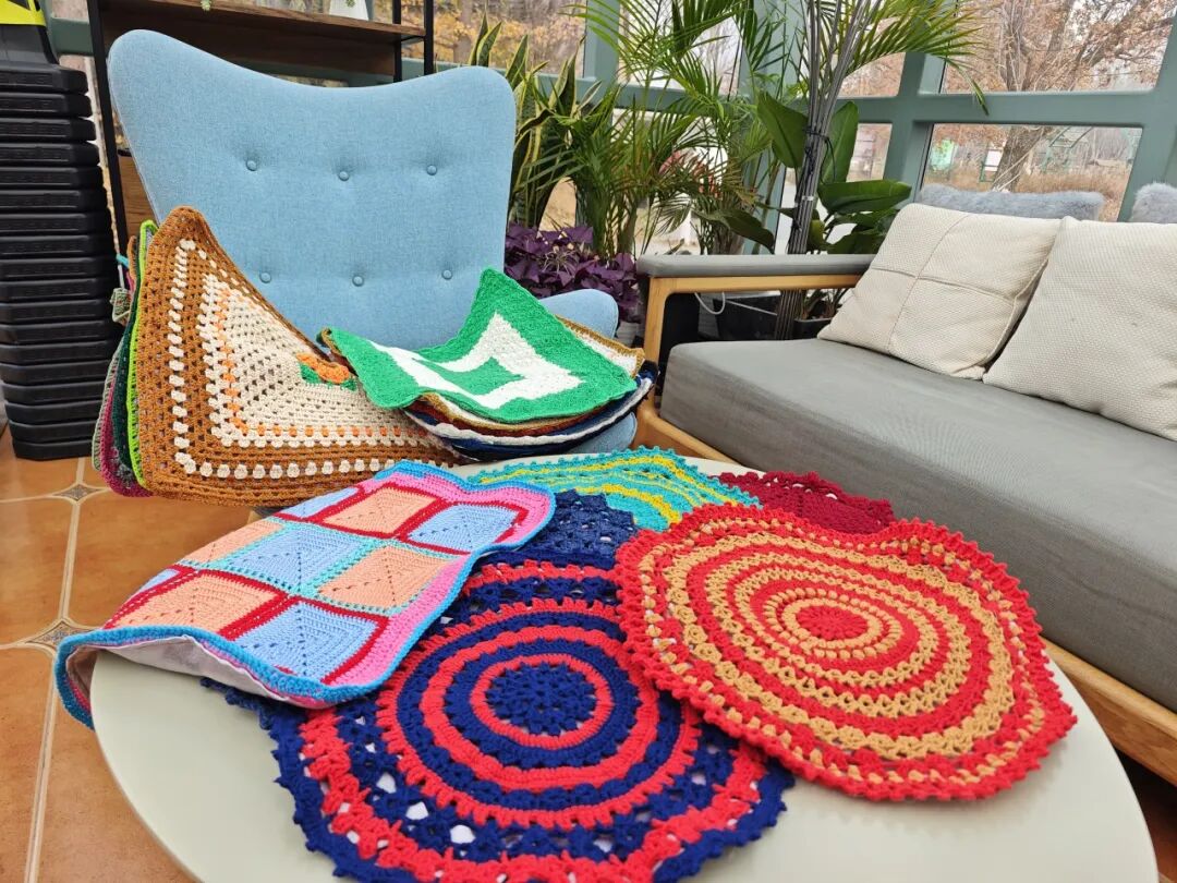 我们也不只是打打毛线,现在也通过我们做的手工艺品做做公益,社团里很多都是因为想参加公益活动而加入的,就比如前段时间我们给敬老院的老人织坐垫,我们一起一共织了一百多个坐垫,最后几天大家都赶工,加班加点做的可带劲了。