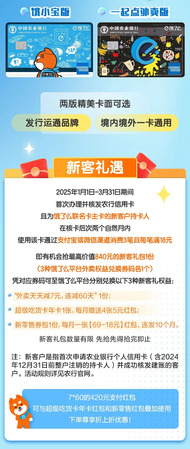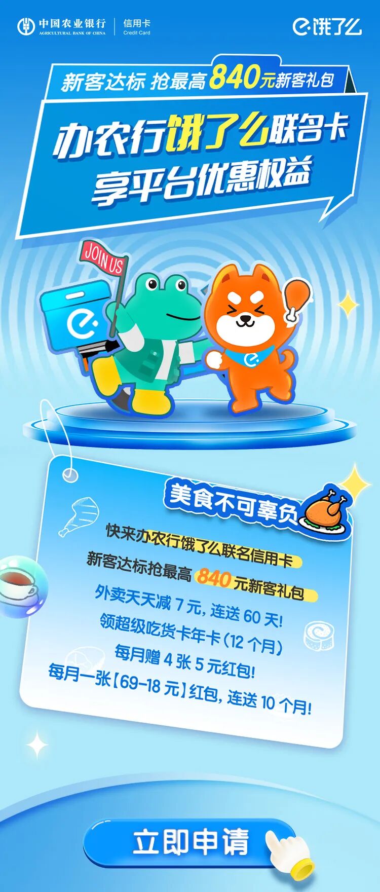 新客礼遇丨农行饿了么联名卡,抢至高840元达标礼!