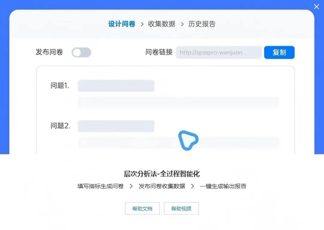 通过填写指标生成问卷 > 发布问卷收集数据 > 一键分析输出报告,实现全流程智能化的层次分析,从调研伊始手把手带你走完全程。