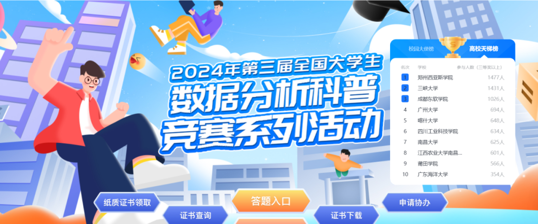 由SPSSPRO和问卷网协办的第三届数据分析科普知识竞赛,今年有国内超2000所高校的8万余名学生参加,超过100所高校申请了协办单位,单所高校最高参与人数近1500。