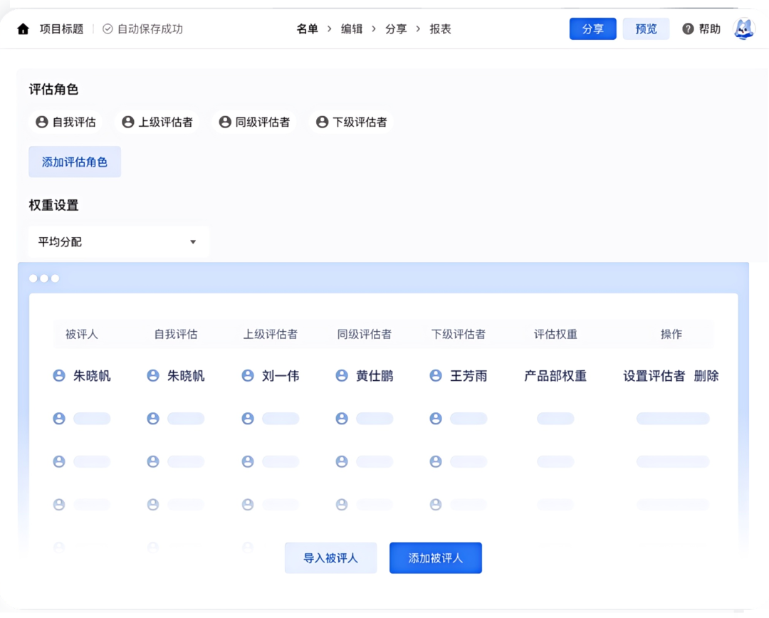 简化名单导入并支持钉钉分发,优化了雷达图/条形图等展示形式,并设置了异常预警和异常分说明,进一步提升360评估能力。多角色多维度的评估系统、简单易用的操作方式、内容丰富的评估报告,帮助企业更轻松、更全面地进行人才测评。