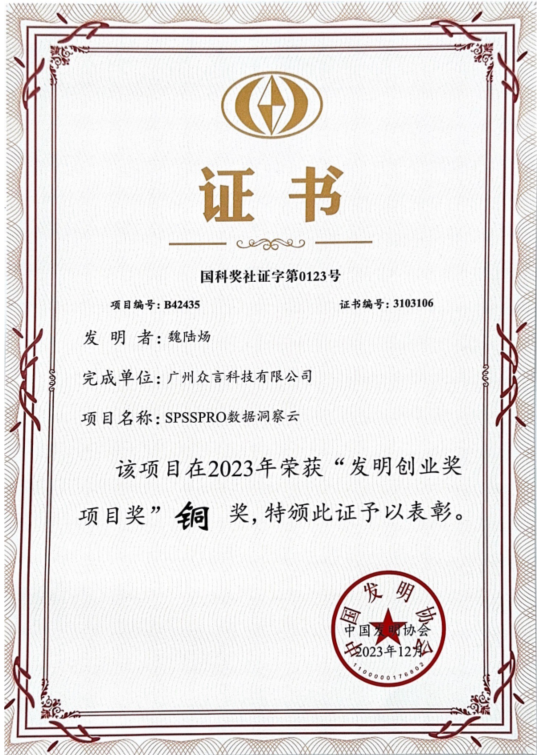 众言科技旗下专业数据分析平台「SPSSPRO」,凭借行业领先的品质实力和突破创新能力,荣获中国发明协会颁发的“发明创业奖项目奖”铜奖。