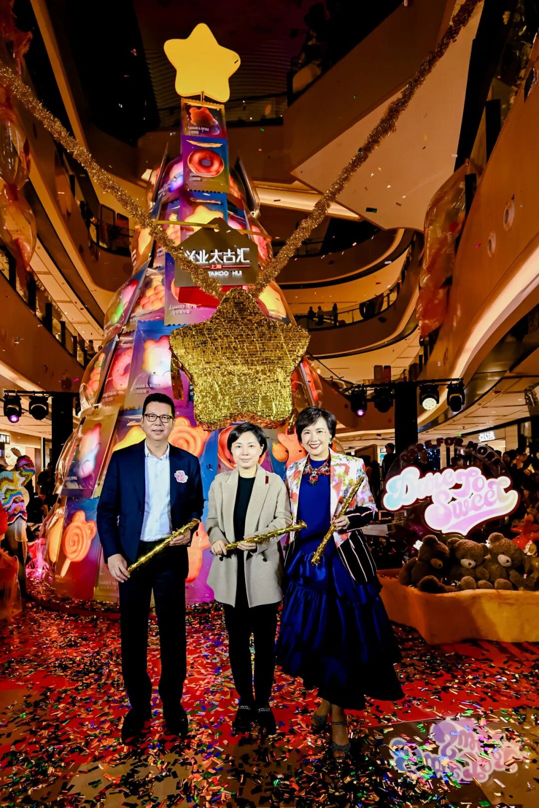 兴业太古汇“Dare To Sweet 命中甜心”开幕派对现场(从左及右:兴业太古汇联席总经理施桂攀先生、上海市静安区商务委员会党组书记、主任沈虹女士、兴业太古汇联席总经理丁瑞芳女士)