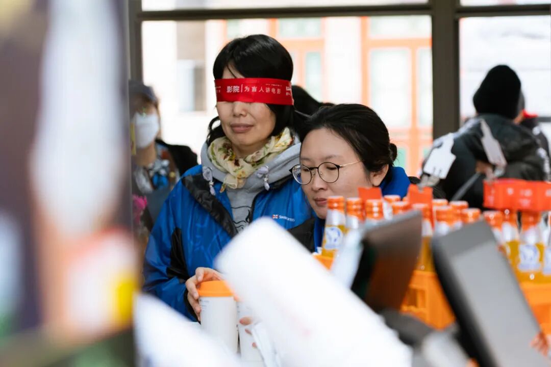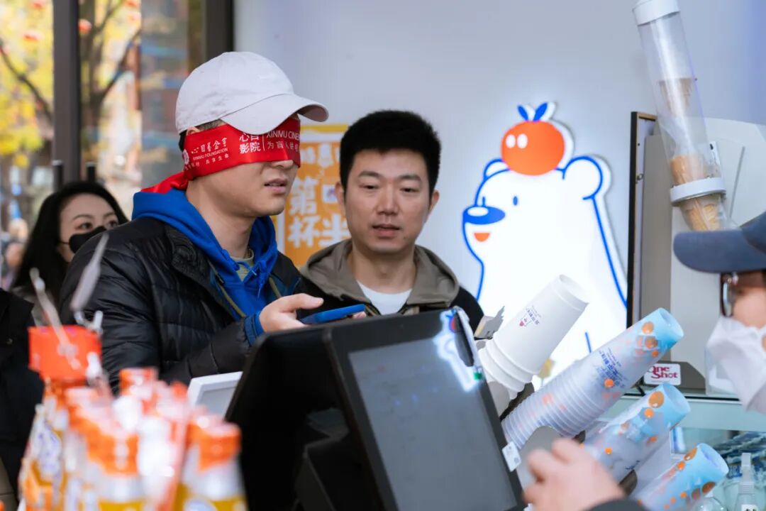 当天活动中最刺激的环节,当属爱心大使们蒙眼结伴去领餐券,去饮料店购买饮料。大家分成几组,每组其中一人当提示员,其余人蒙上双眼,去完成领餐券、到零售门店买饮料的任务,返程时,每组中人员的角色交换。