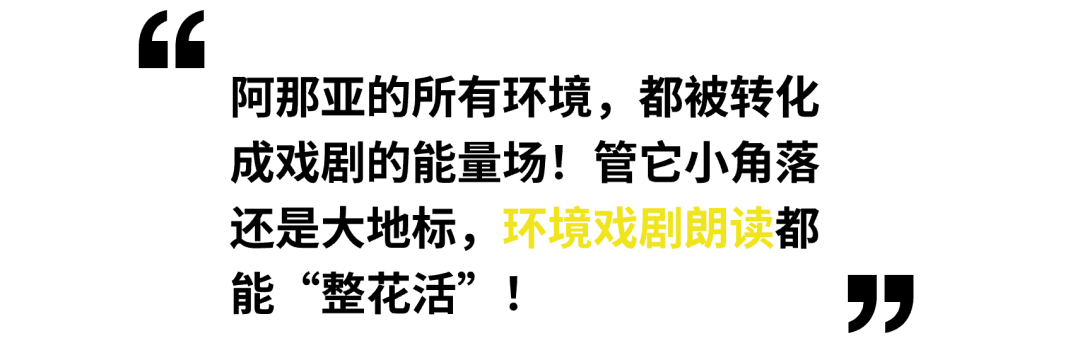 戏剧艺术板块中的环境戏剧朗读,绝对算得上是阿那亚戏剧节最不设限的一环,也是无数观众最期待的一环!前两届的环境戏剧朗读为我们留下了许多难忘回忆,导读导演们在阿那亚尽情折腾,把文本、时间、空间 “玩”出了新花样!
