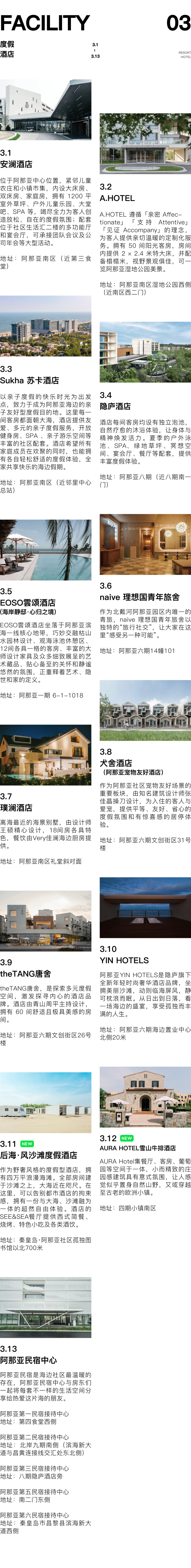 新鲜配套正在海边精彩呈现,在这里,送上一份全新出炉的的阿那亚全配套攻略。在阿那亚APP上,可以进一步了解配套的咨询电话、实时营业状态及定位导航等信息。