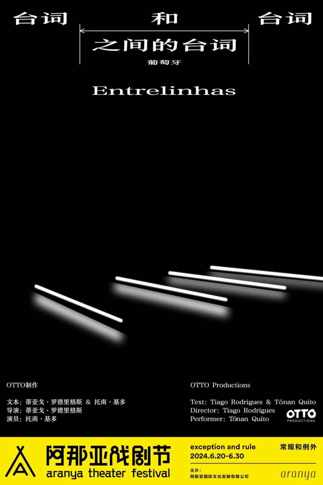 在这出戏上演之前,我们或许可以先了解一下创作的契机:导演蒂亚戈·罗德里格斯在一次创作中,必须为托南·基多写一出新的独角戏剧本,但由于未被公开的原因,剧本迟迟未能完成。就在那时,一系列真实而又充满文学色彩的意外事件催生了这部《台词和台词之间的台词》。这部剧转而趋向一种有关与期冀的表达:我们对剧场和戏剧的期望。