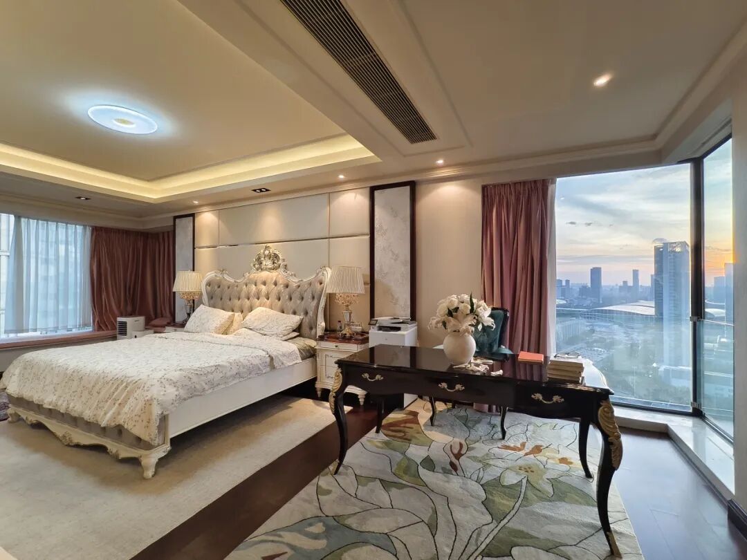 步入室内,卧室的一侧,一扇巨大的窗户如同画框,将城市的天际线引入室内,展现出这套房子所处的非凡高度与开阔视野。