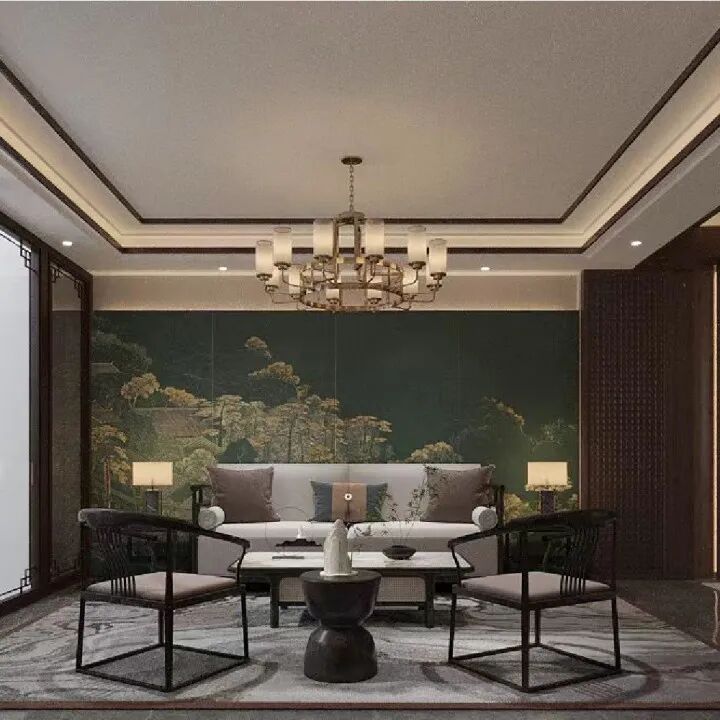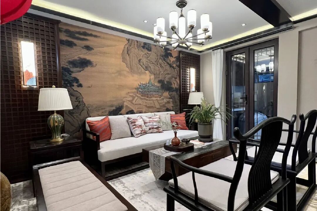 客厅背景墙上悬挂着一幅大幅山水画,山峰巍峨,树木葱郁,尽显古色古香的文化气息。两侧的木质窗格设计精巧,搭配壁灯,不仅增添了空间的层次感,还丰富了光线效果。